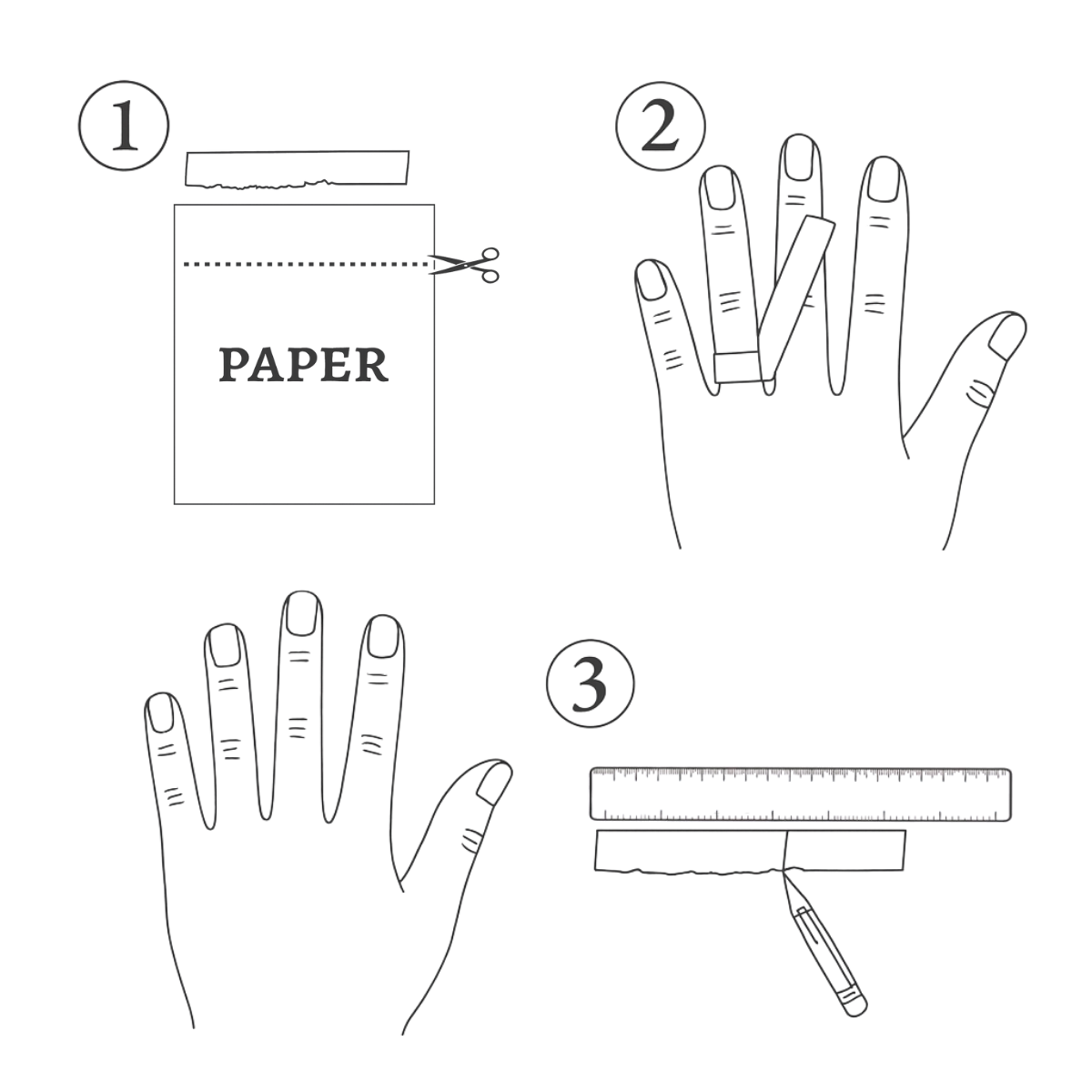 Wrap a strip of paper around the knuckle of your finger and mark where the ends meet. Measure the length in millimeters, and when placing your order, select this measurement under “Circumference” as your ring size.